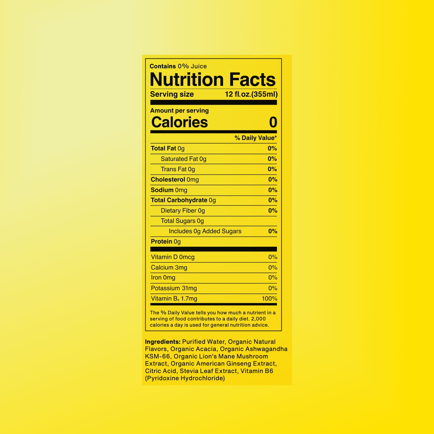 Purified Water, Organic Natural Flavors, Organic Acacia, Organic Ashwagandha KSM-66, Organic Lion's Mane Mushroom Extract, Organic American Ginseng Extract, Citric Acid, Stevia Leaf Extract, Vitamin B6 (Pyridoxine Hydrochloride)